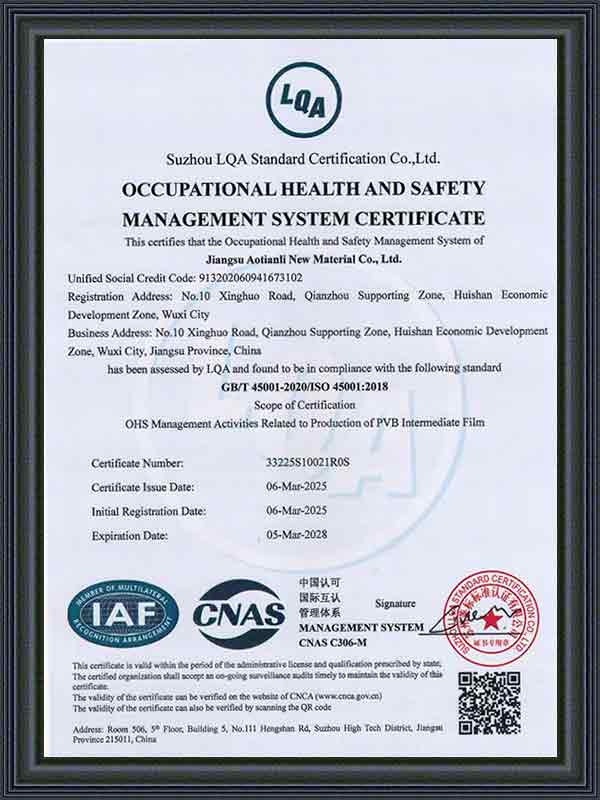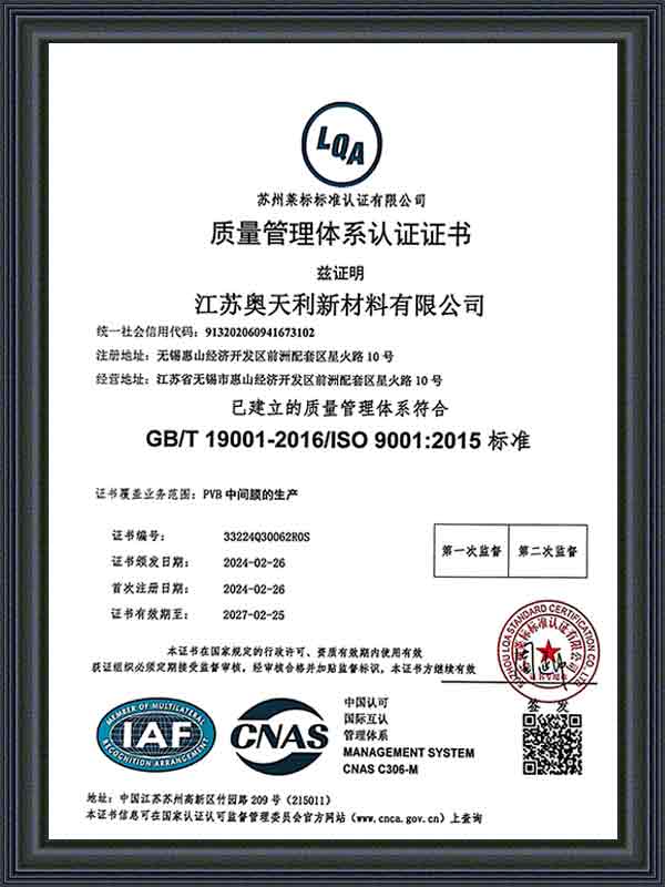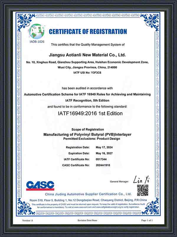 บริษัท Jiangsu Aotianli ใหม่วัสดุ Co., Ltd. (ATL) ก่อตั้งขึ้นในปี 2014 และมีสำนักงานใหญ่ในเมืองอู๋ซี มณฑลเจียงซู ซึ่งเป็นบริษัทที่เชี่ยวชาญด้านการวิจัย พัฒนา ผลิต และจำหน่ายฟิล์ม PVB interlayer ประสิทธิภาพสูง ด้วยกระบวนการผลิตขั้นสูง นวัตกรรมทางเทคโนโลยีที่ต่อเนื่อง และรูปแบบห่วงโซ่อุปทานที่สมบูรณ์ ATL จึงได้สร้างตำแหน่งที่สำคัญในตลาดฟิล์ม PVB interlayer ทั้งในและต่างประเทศ